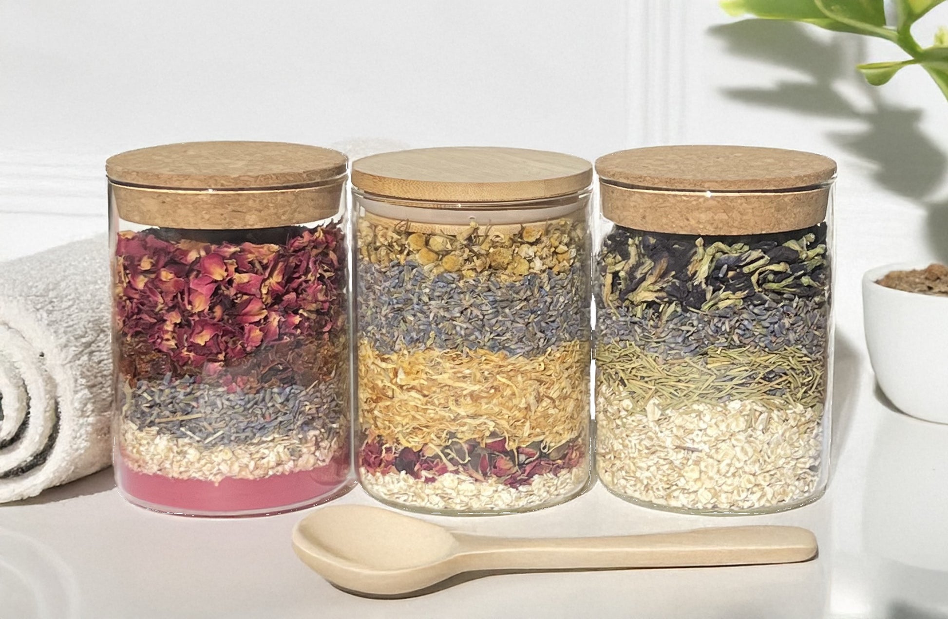 セット内容: Relax(ラベンダー、ローズマリー、オートミール、バタフライピー)、Energy(マリーゴールド、カモミール、ローズ、ラベンダー、オートミール)、Pink(ローズヒップ、ラベンダー、ローズ、オートミール、ビーツ)